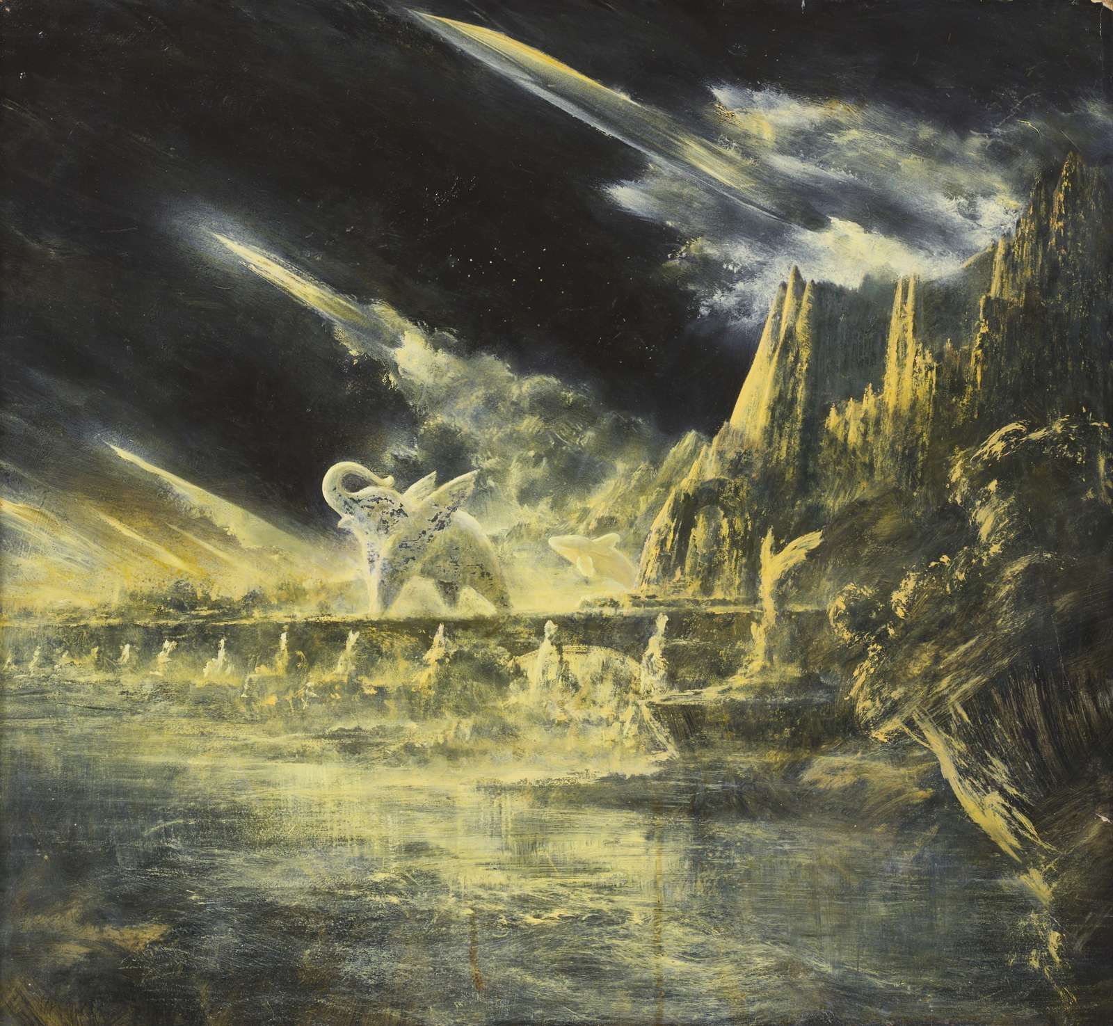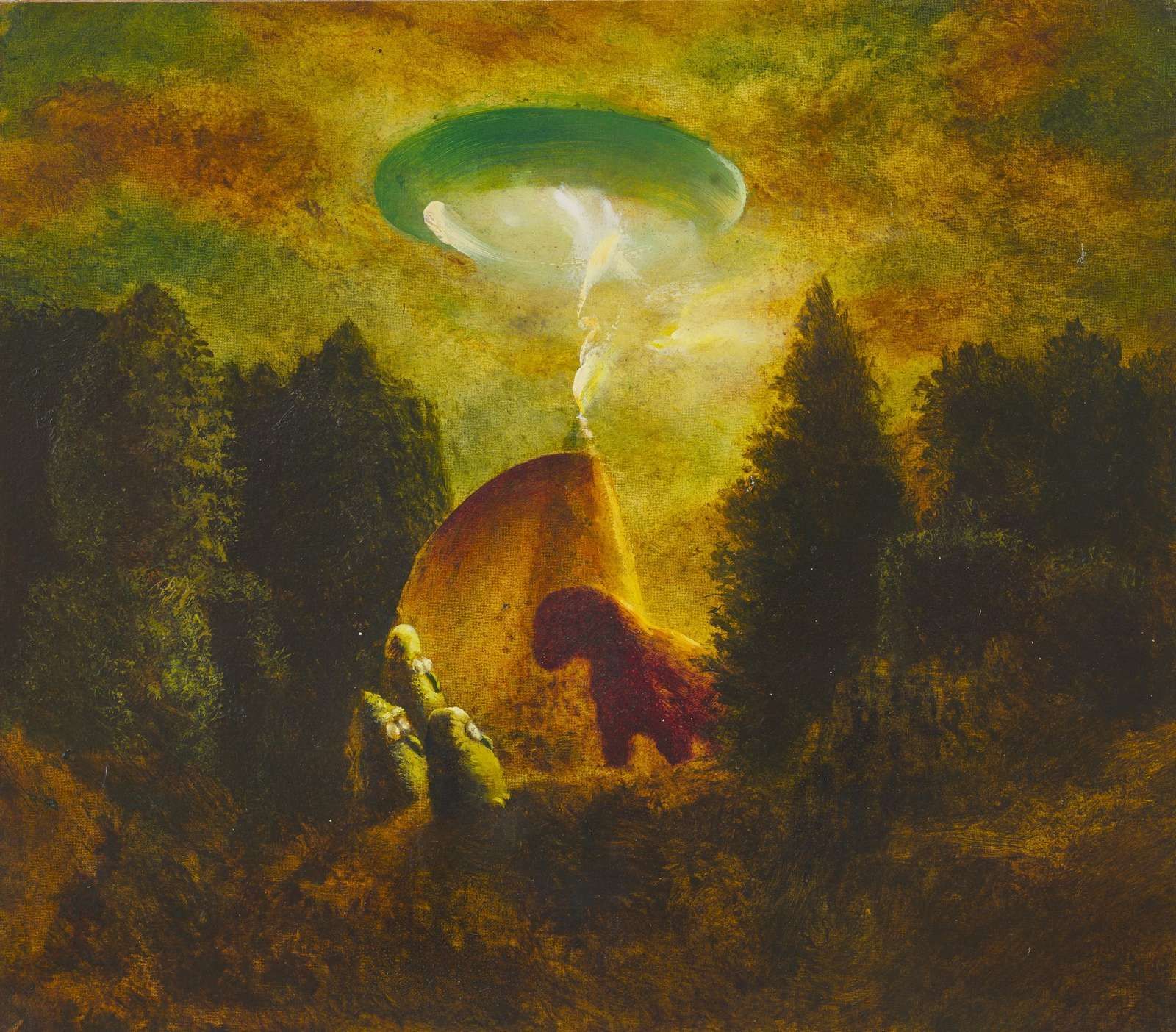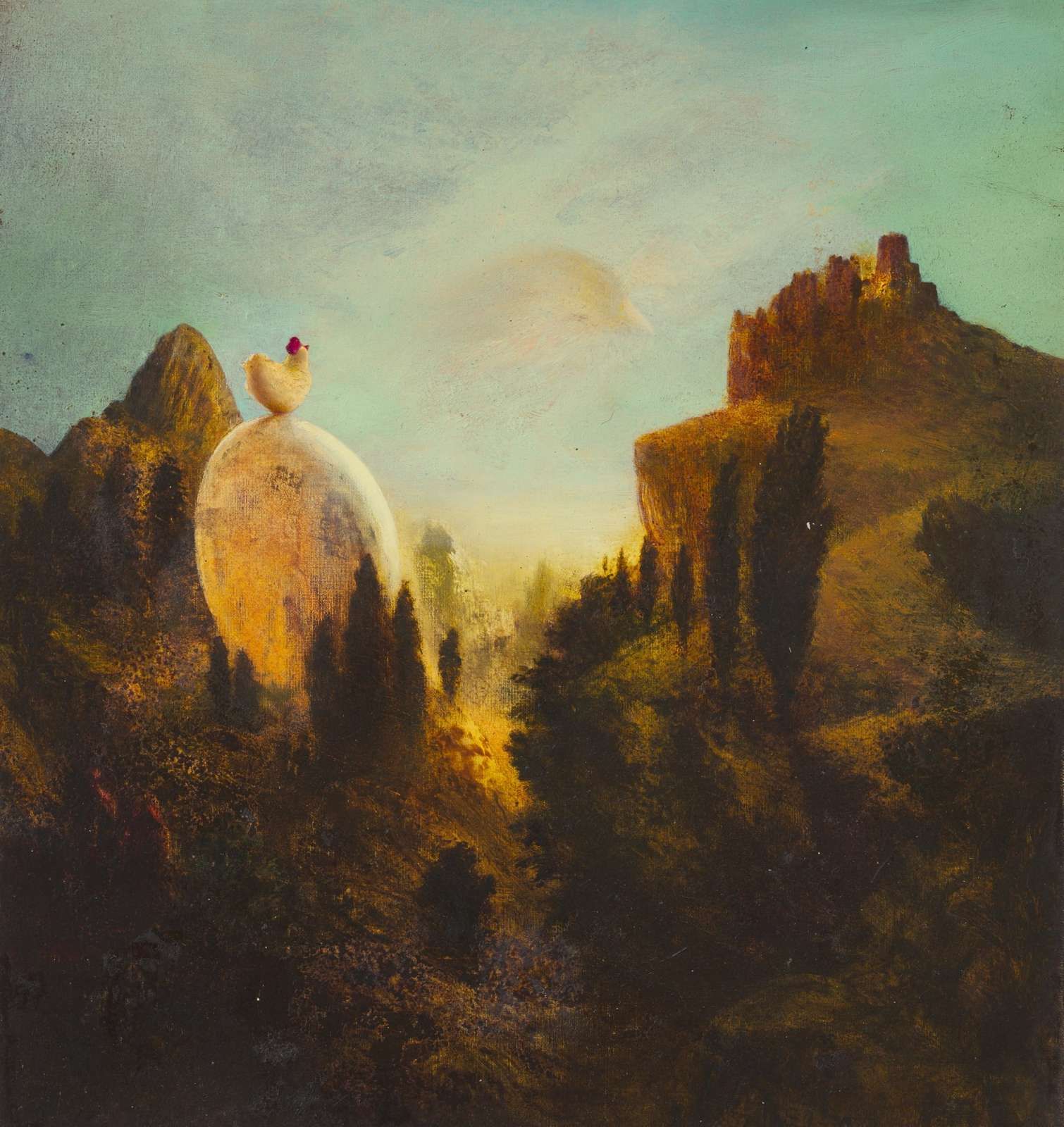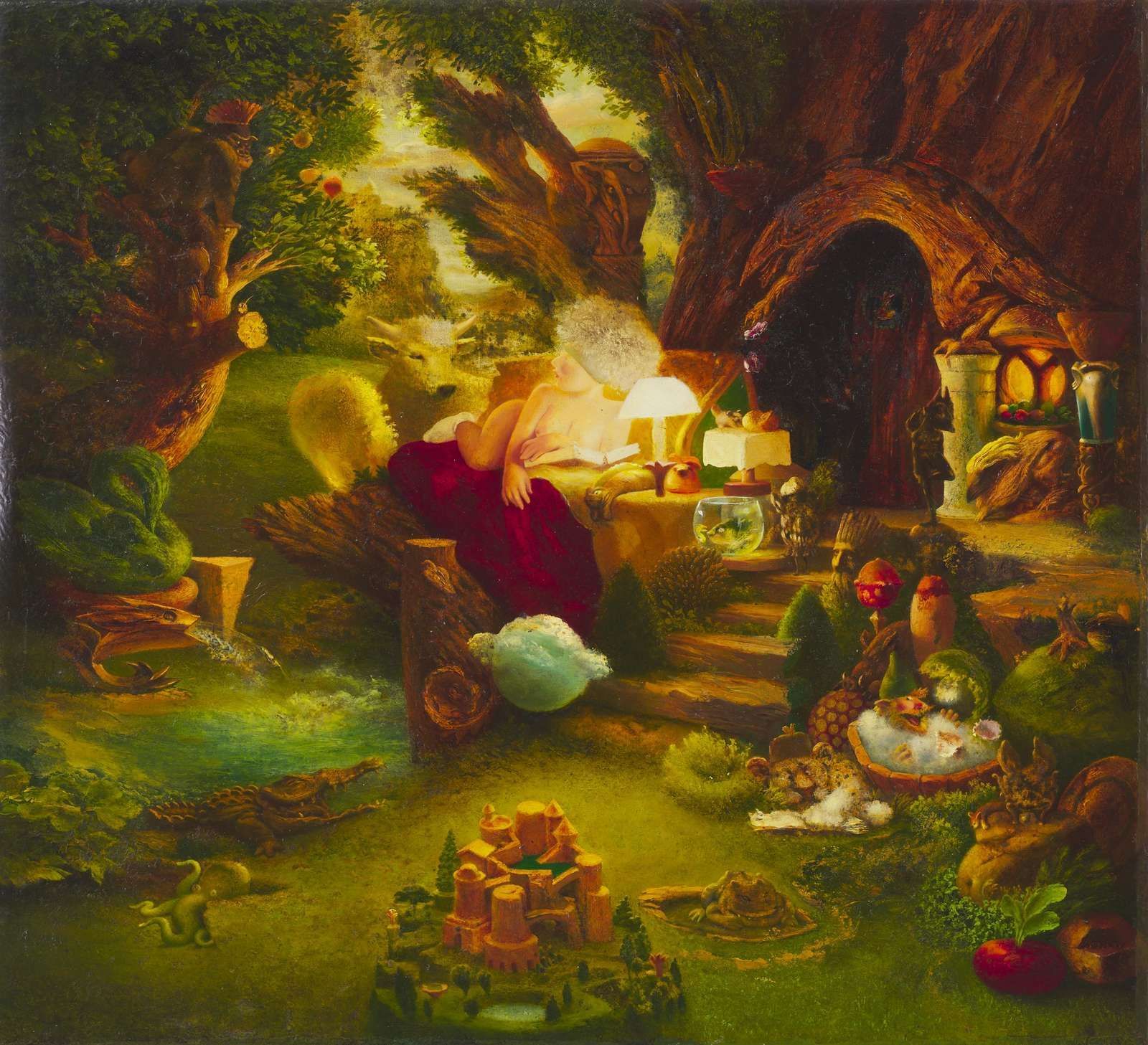 Nel tempo, le sue scene si animano e appaiono personaggi da favola. L’incubo esistenziale si è tramutato in paesaggi sereni e idilliaci, in conversation pieces che hanno per attori principali gli improbabili abitanti di un mondo alla Tolkien. I colori si fanno più chiari e luminosi. Il magma primordiale, quasi infernale, viene sconfitto dall’illusione, dal sogno, dalla speranza, dal mito arcadico. L’ironia domina. Un sorriso benevolo, anche se consapevole della finzione, si stende su azioni e personaggi.