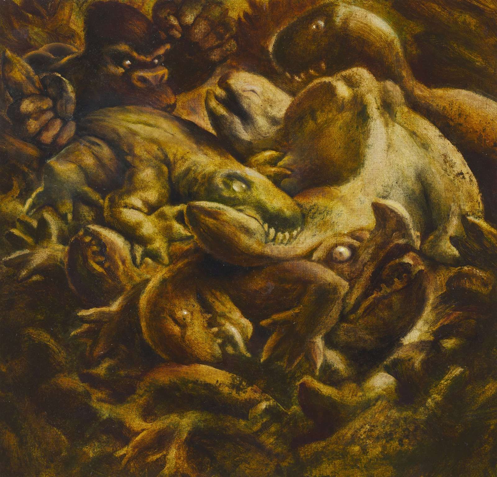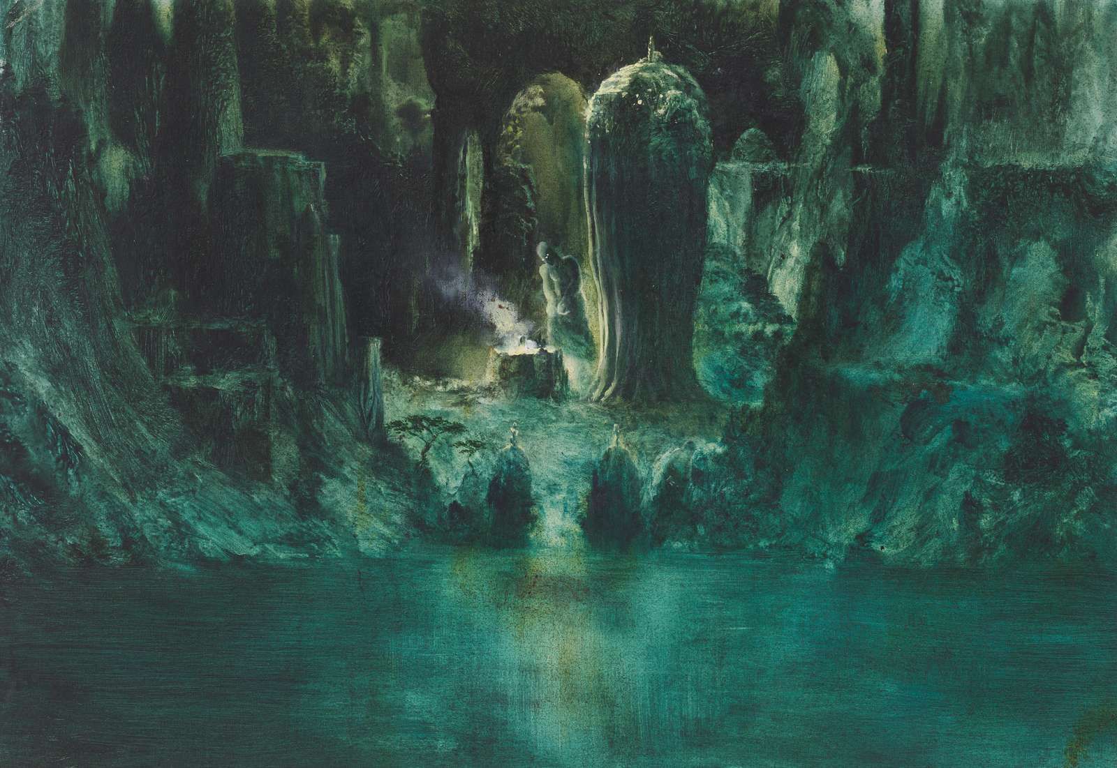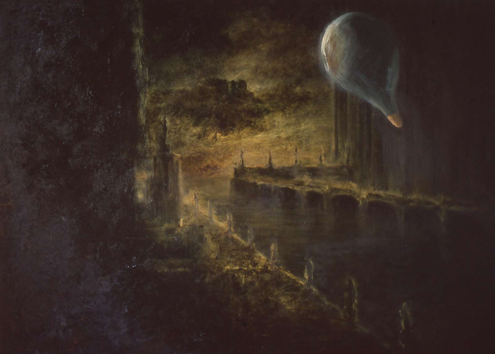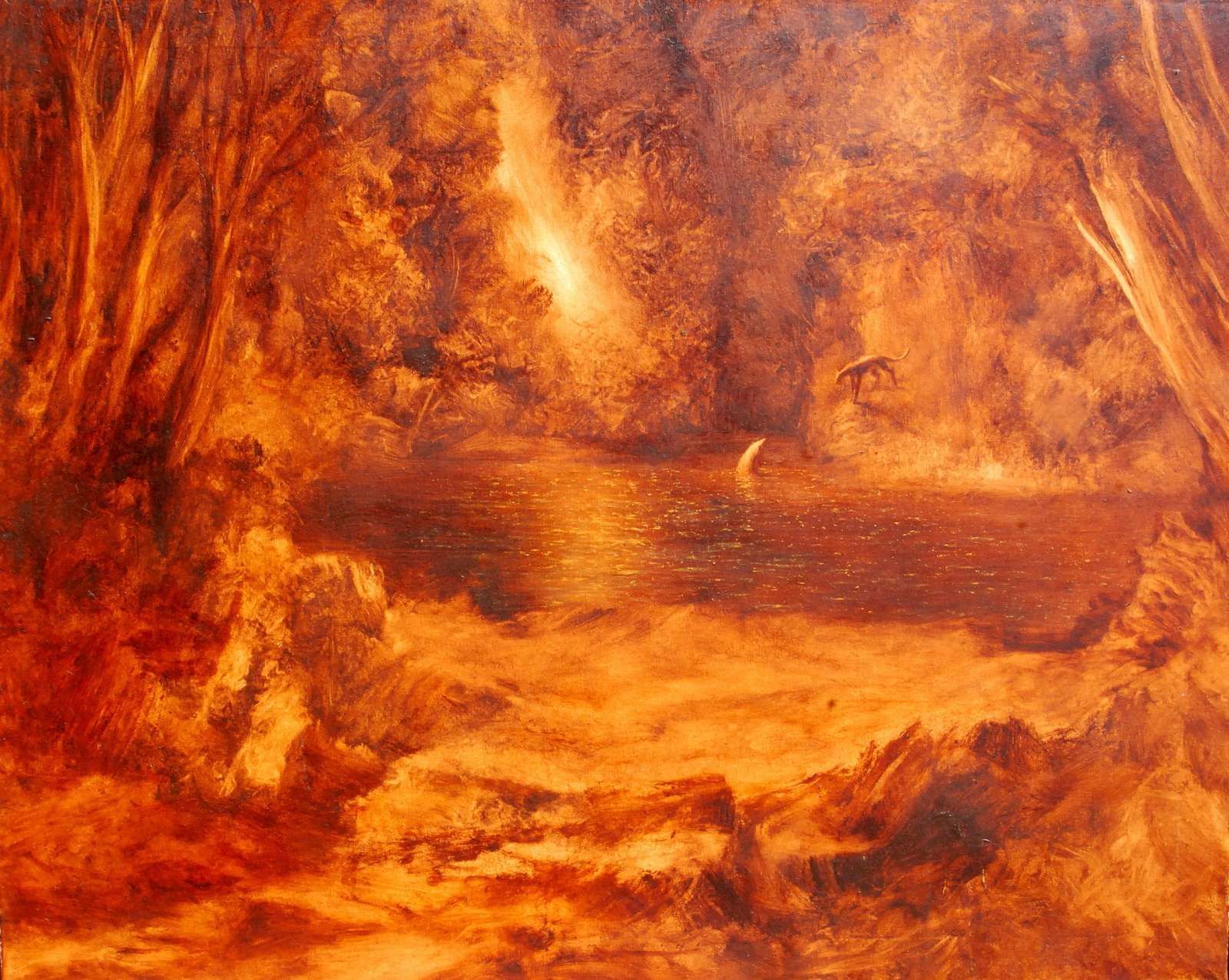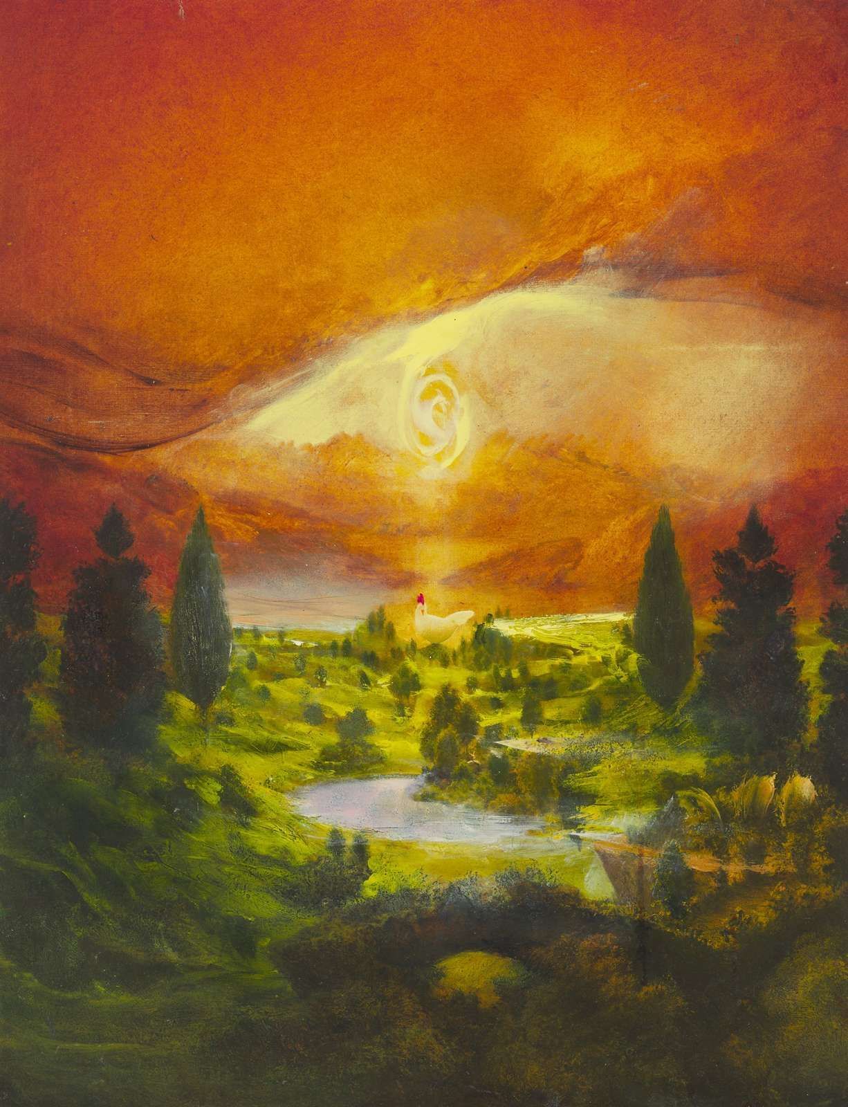 Nel tempo, le sue scene si animano e appaiono personaggi da favola. L’incubo esistenziale si è tramutato in paesaggi sereni e idilliaci, in conversation pieces che hanno per attori principali gli improbabili abitanti di un mondo alla Tolkien. I colori si fanno più chiari e luminosi. Il magma primordiale, quasi infernale, viene sconfitto dall’illusione, dal sogno, dalla speranza, dal mito arcadico. L’ironia domina. Un sorriso benevolo, anche se consapevole della finzione, si stende su azioni e personaggi.