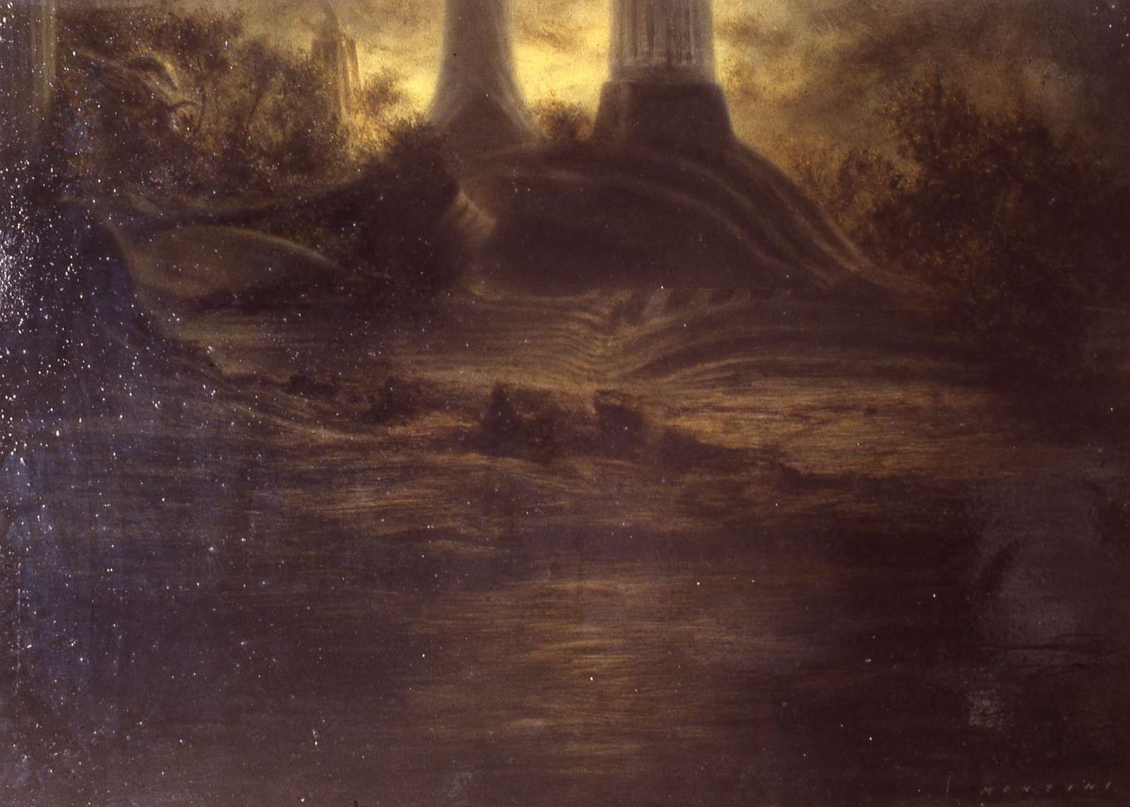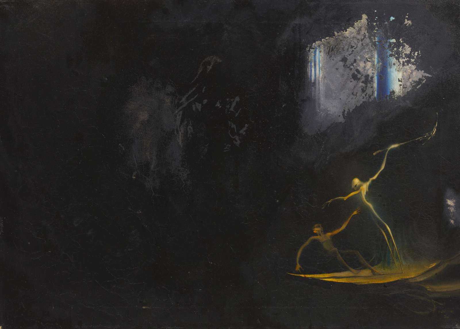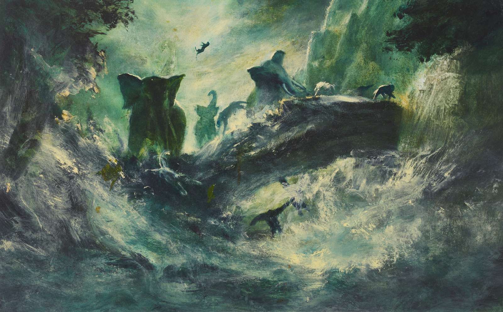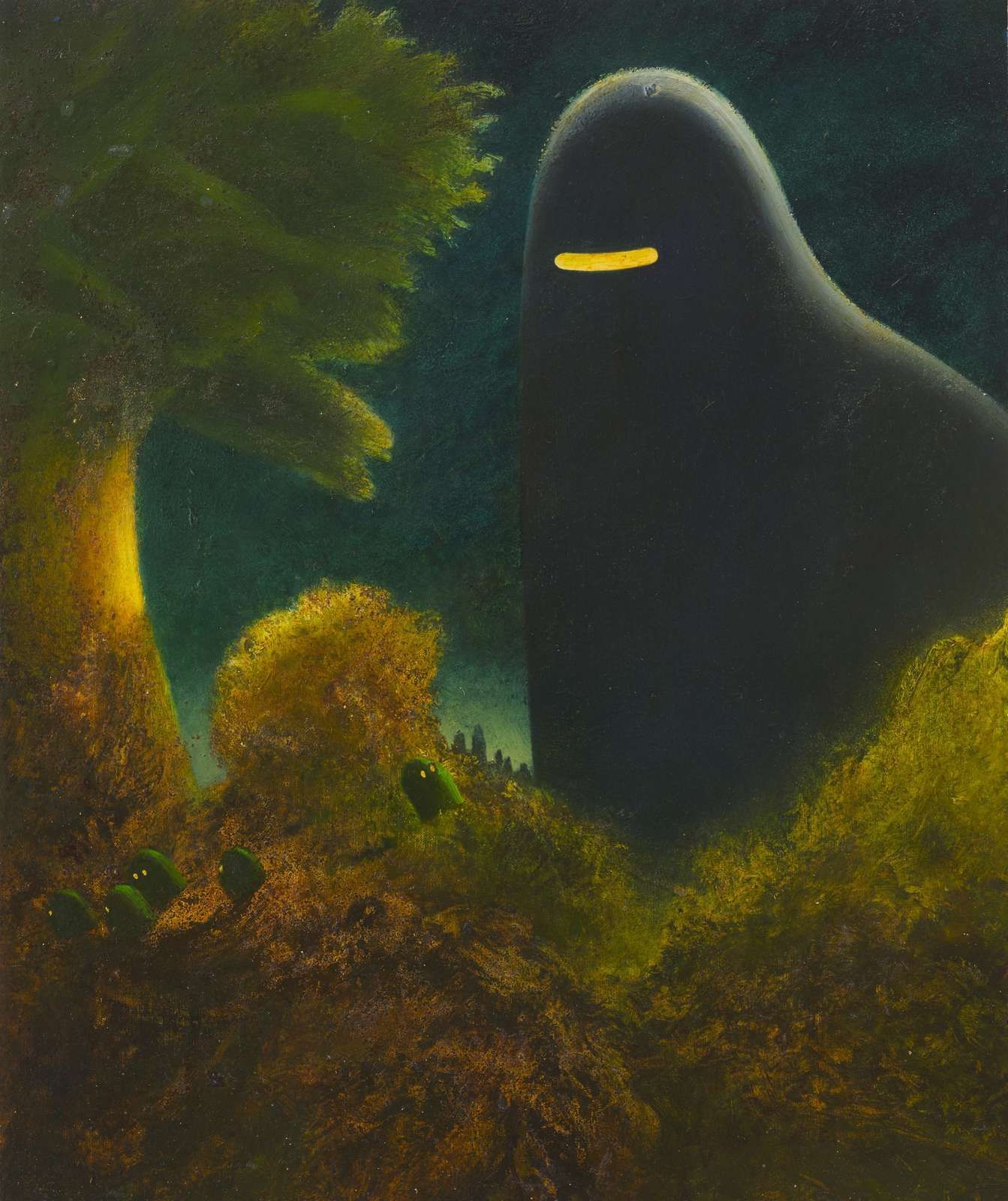 Nel tempo, le sue scene si animano e appaiono personaggi da favola. L’incubo esistenziale si è tramutato in paesaggi sereni e idilliaci, in conversation pieces che hanno per attori principali gli improbabili abitanti di un mondo alla Tolkien. I colori si fanno più chiari e luminosi. Il magma primordiale, quasi infernale, viene sconfitto dall’illusione, dal sogno, dalla speranza, dal mito arcadico. L’ironia domina. Un sorriso benevolo, anche se consapevole della finzione, si stende su azioni e personaggi.
