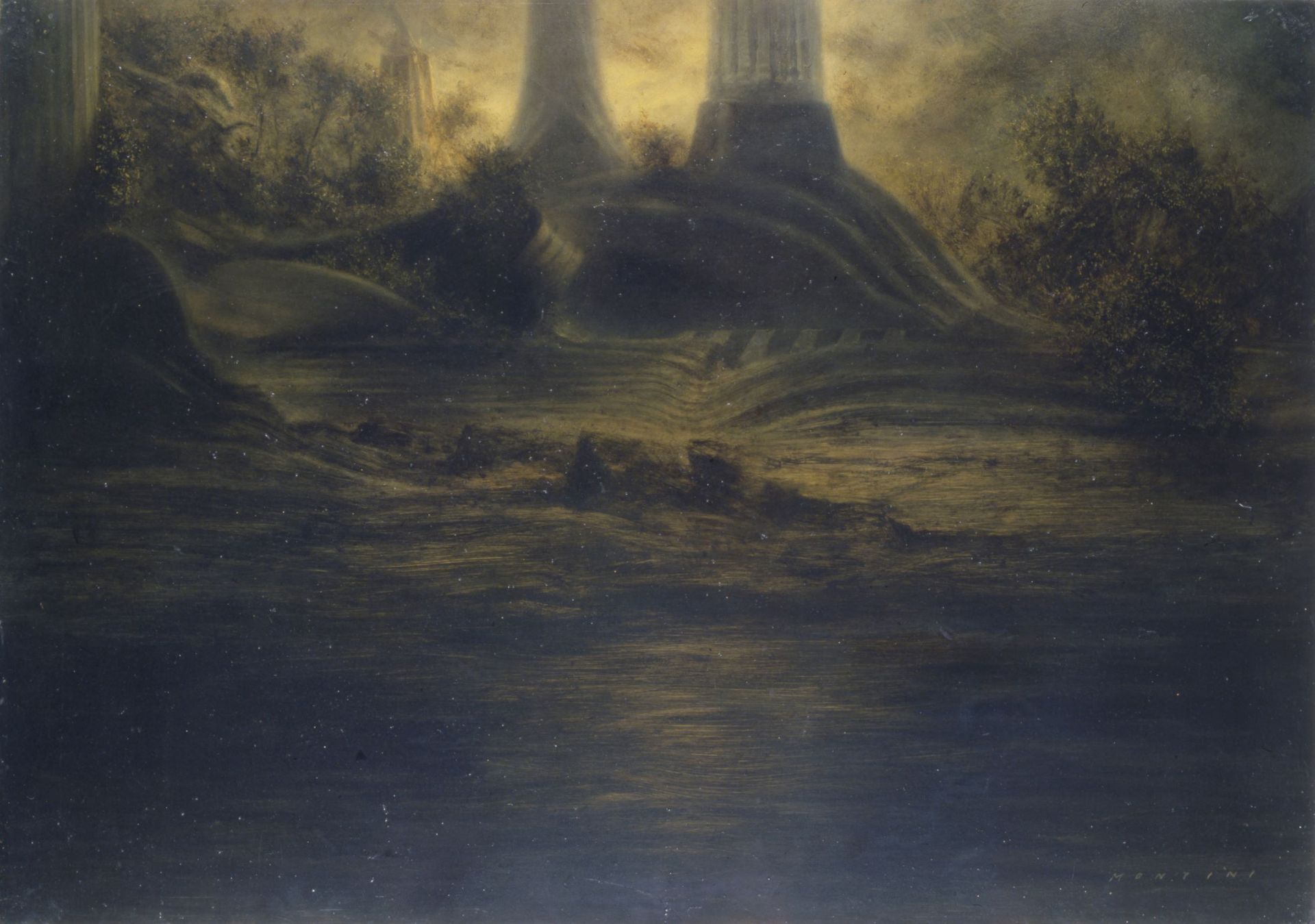 Infine, la Hudson River School con pittori alla scoperta di paesaggi più realistici e dettagliati di quanto non avessero fatto i loro riferimenti: Lorrain, Constable e Turner. Di uno di questi, Thomas Cole, non possiamo non citare il quadro “The Titan’s Goblet”: il calice del titano che Montini ha ripreso in uno dei suoi rari quadri dedicati ai fiori. Sempre di Cole si vadano a visitare le immagini relative al ciclo “The Course of Empire”.I cinque dipinti di Cole, a volte parzialmente citati da Montini, sono una sorta di allegoria che rappresenta le fasi del decadimento dell’umanità. Gli episodi sono: “Stato Selvaggio”, “Stato Arcadico o Pastorale”, “Compimento dell’Impero”, “Distruzione”, “Desolazione”. Montini sembra avere shakerato quest’opera, averne ripreso brani, sconvolto la successione. Se il quadro finale di Cole è una scura immagine in cui sono evidenziati i segni della caduta di una grandiosa città immaginaria (rovine, ponti crollati, una sola colonna ormai nidificata) a simbolo di un possibile futuro in cui l’umanità è stata distrutta dalle proprie mani, le ultime opere di Montini sono invece più vicine a Pinocchio che ad Amleto.